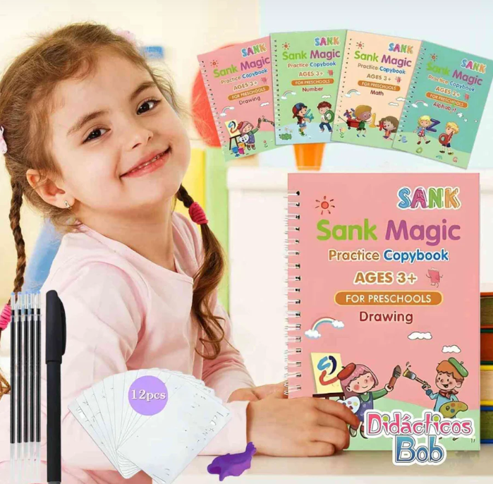🟠 4 libros mágicos diferentes que incluyen letras de escritura, números de escritura, dibujo, matemáticas e ingles.